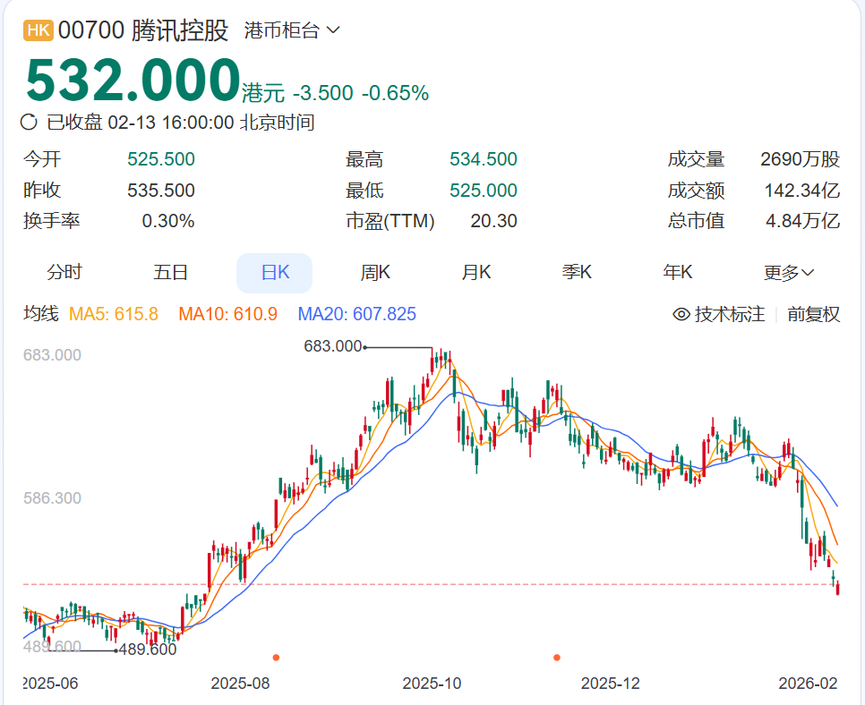 当投资者将眼神从正经的盈利增长转上前沿模子建树和聊天机器东说念主竞争时,腾讯的估值已回落至连年低位。本年以来,腾讯港股已大跌10%,较客岁的高点更是跌去21%。