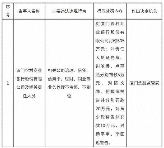 【大河财立方音书】2月14日欧洲杯体育,国度金融监督管制总局厦门监管局表露的行政处罚信息解析,厦门农村贸易银行股份有限公司因相关公司处治、信贷、信用卡、瓦解、同行等业务管制不审慎、不到位等不法违章事实,被罚605万元。