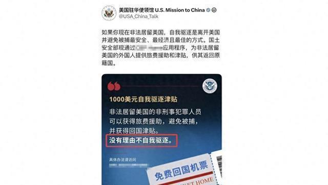 好意思国大使馆喊话犯罪外侨:自我圮绝,最高奖励1000好意思元津贴! 5月28日,好意思国驻华大使馆在酬酢媒体用中英文发布了一则“自我圮绝”告示,意义是,当今犯罪居留在好意思国的非刑事违纪东说念主员,若是见机离开好意思国,那将补助你1000好意思元差旅费离开好意思国,若是不见机离开被FBI持到了,那不好意义,一分圮绝补贴皆莫得!好意思国大使馆临了还不忘用大字补一句:有1000好意思元给各人,各人莫得领略不自我圮绝!