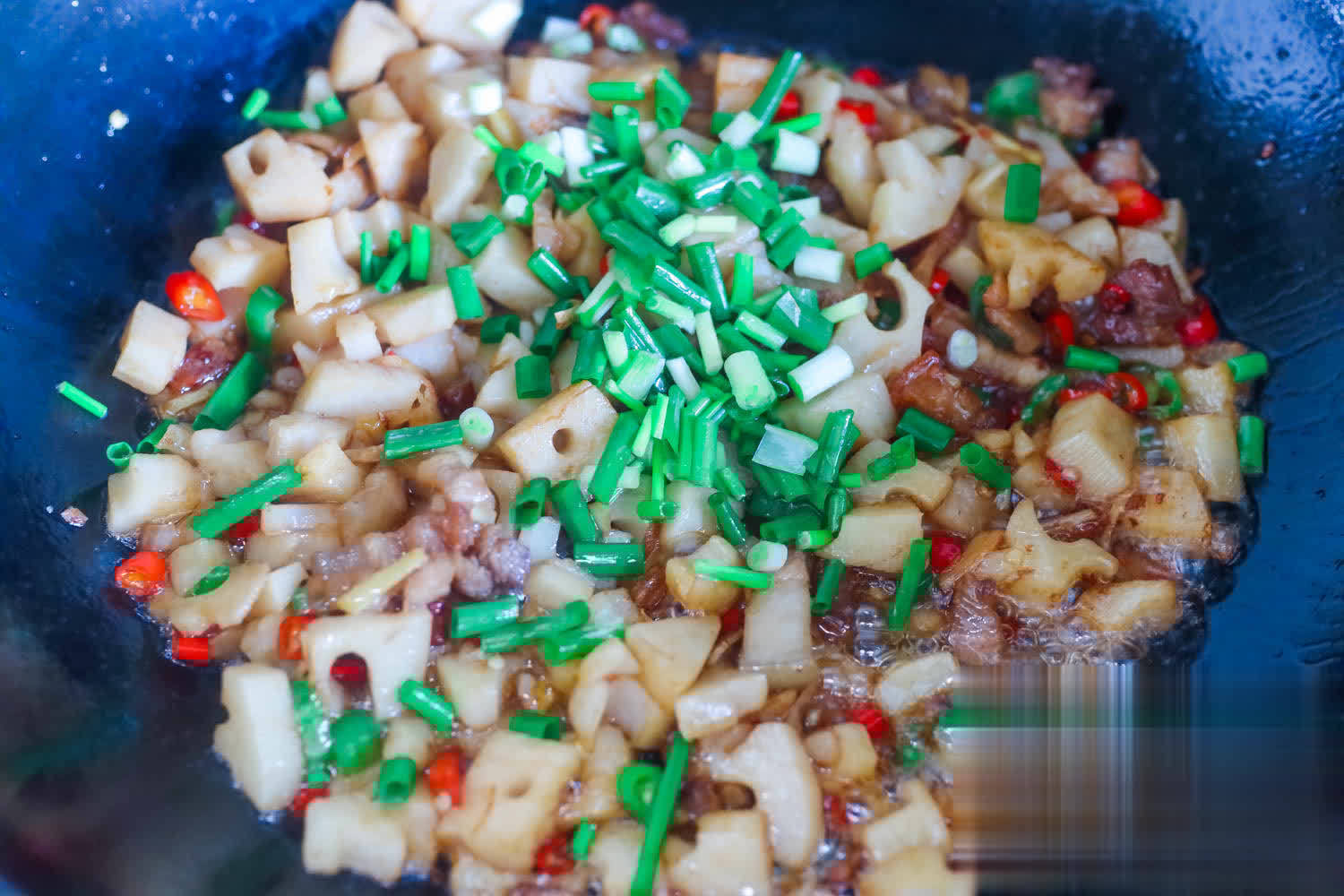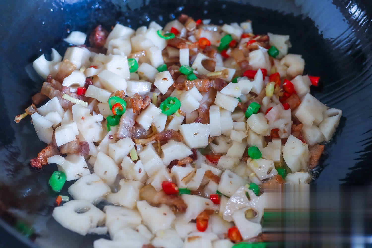 5、倒入莲藕,快速的翻炒1分钟的容貌就不错了,莲藕蓝本不错生吃,是以不必炒太长的时刻。加生抽,蚝油调味。