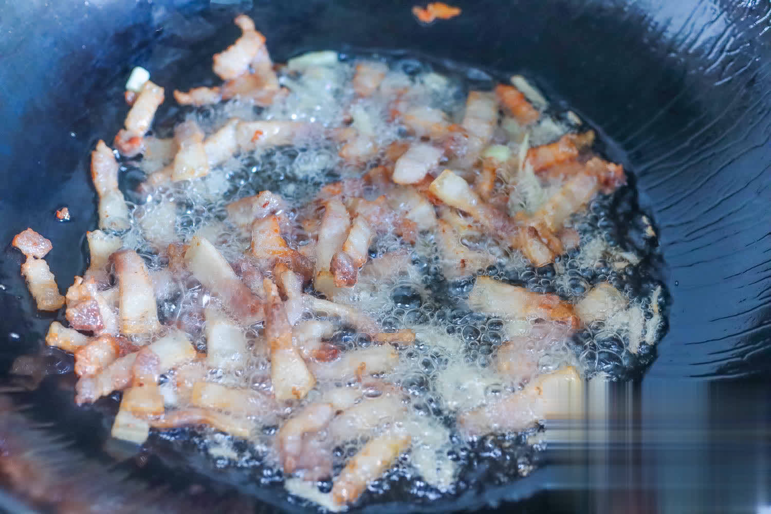 3、锅里少放少量油,先把五花肉放进来炒出油脂,炒到焦黄上色的状况,香喷喷的。