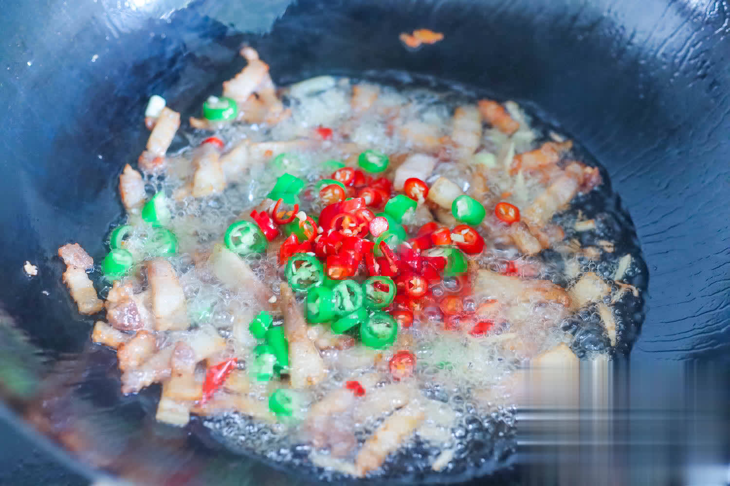 4、再放生姜,小葱,小米椒,青椒全部炒出香味,能吃辣的就放双椒,不成吃的不要放。