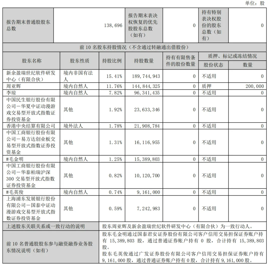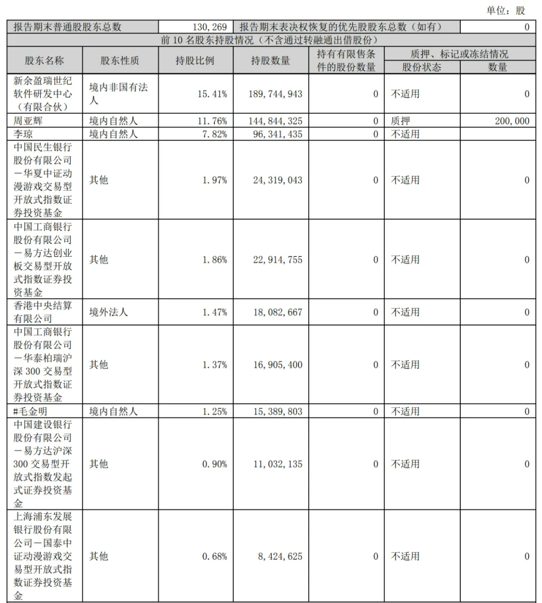 落幕2024年6月30日,新余盈瑞世纪软件研发中心(有限合股)握股为15.41%,周亚辉握股11.76%,李琼握股7.82%,中国民生银行股份有限公司-中原中证动漫游戏交游型怒放式指数证券投资基金握股为1.92%,香港中央结算有限公司握股为1.78%;